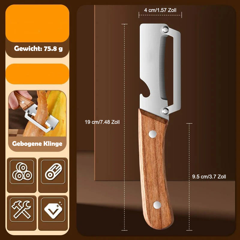 Doppelfunktion: Kann auch als praktischer Flaschenöffner für Getränke verwendet werden. Ein vielseitiges Werkzeug, das nahtlos von der Küchenvorbereitung zum Servieren und Unterhalten übergeht – ein unverzichtbares Accessoire für jeden Haushalt.